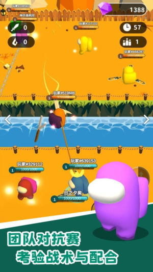 1、玩家需要灵活运用钩子技能勾中敌人,在规定时间内勾中数量越多排名越靠前,考验玩家的反应速度和操作技巧。
