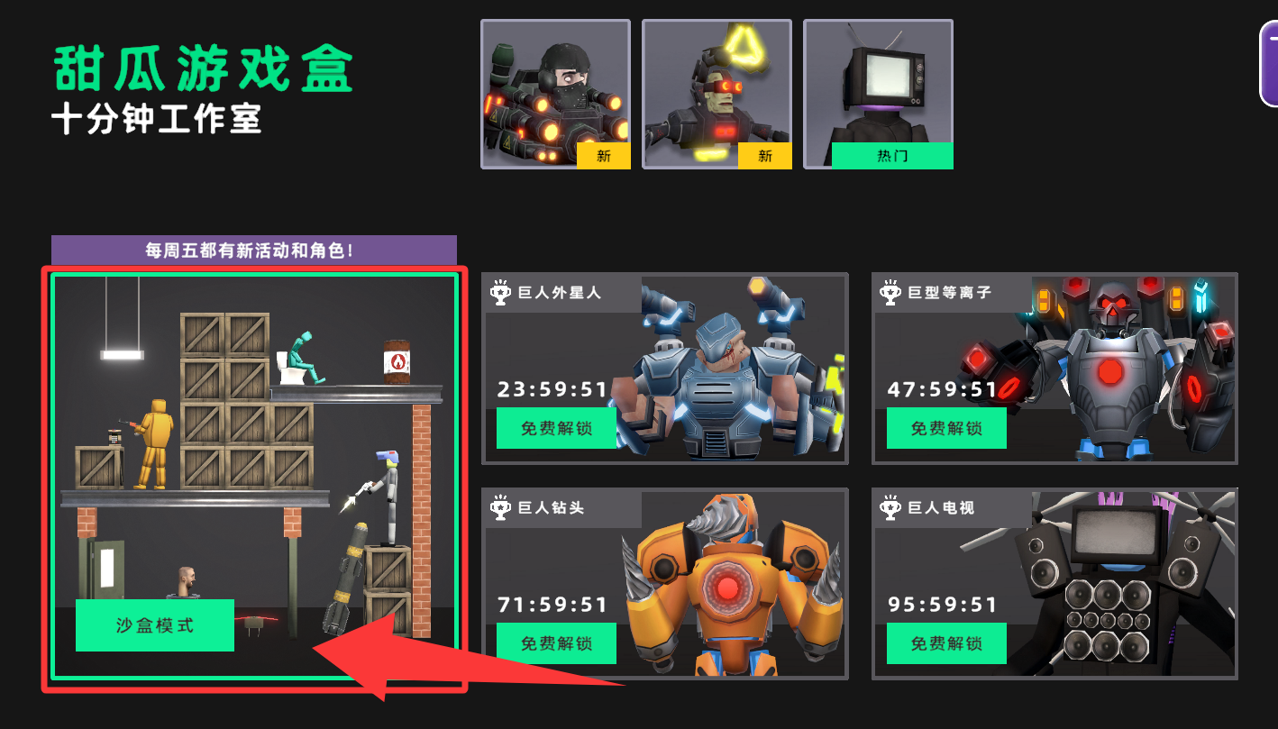 - 甜瓜游戏盒是集合多种模组玩法的休闲对战游戏,游戏以自由探索与战斗为核心,玩家可以在开放世界中设计地图、搭配模组、解锁角色,如马桶人、电视人、监控