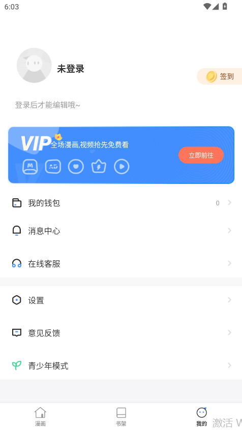 1、首先请在本站下载并安装漫飞阅读,安装完成后打开app进入到主界面。