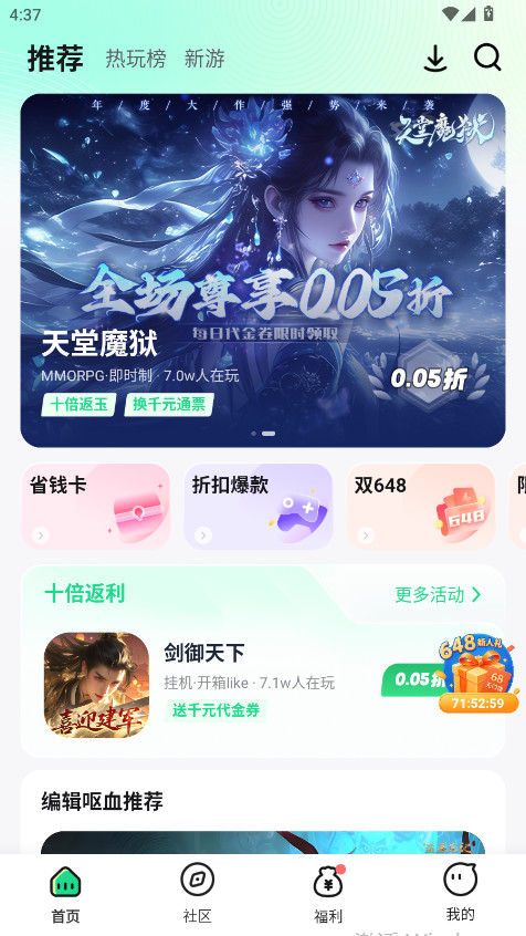 3、进入“福利”板块,参与任务赚金、领取礼券,在领券中心兑换游戏礼包;关注庆典活动、福利宝库等,获取限时优惠和奖励。