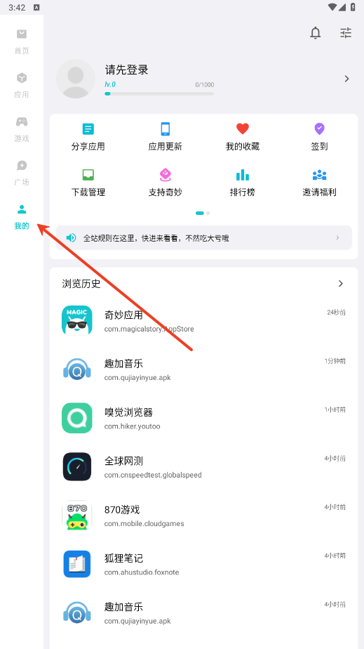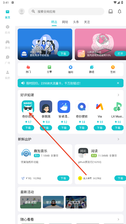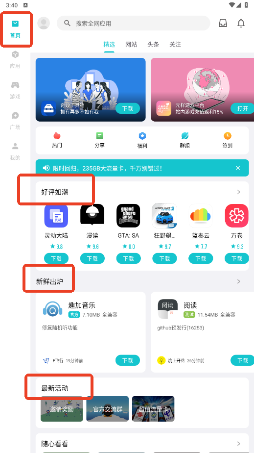 1.进入主界面后,可以通过左侧菜单栏选择不同的应用类别,如游戏、应用、广场等,轻松找到感兴趣的应用。