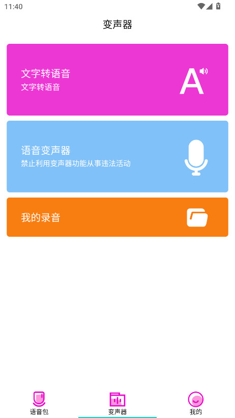 7.返回,点击下方的变声器,可以看到这里有着文字转语音、语音变声器、我的录音三大板块内容,大家可以根据自己的实际需求点击对应的功能使用哈。