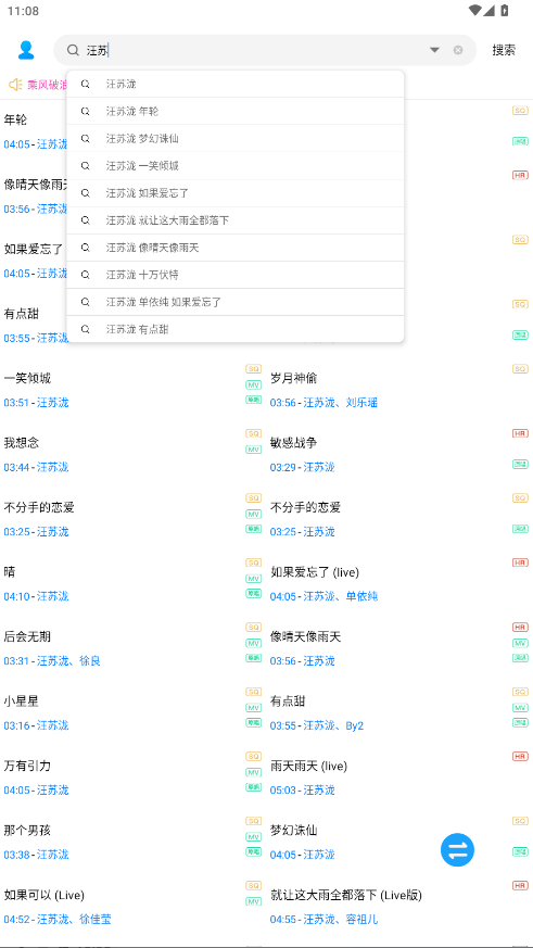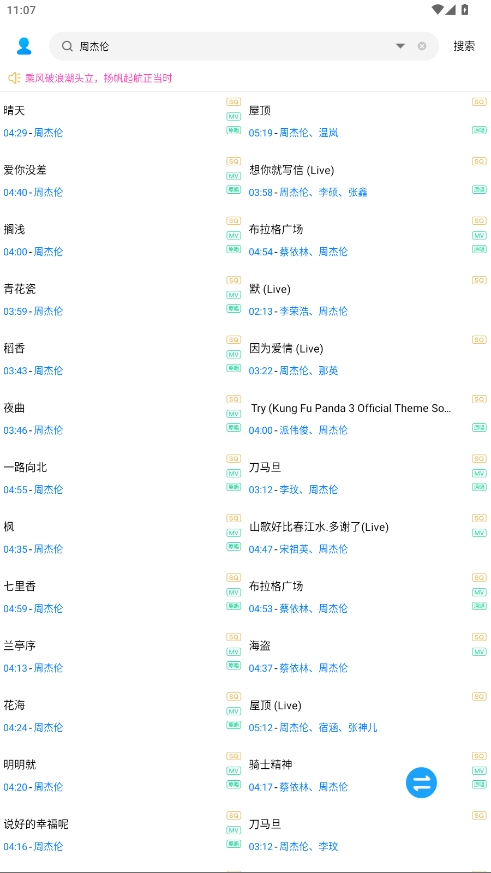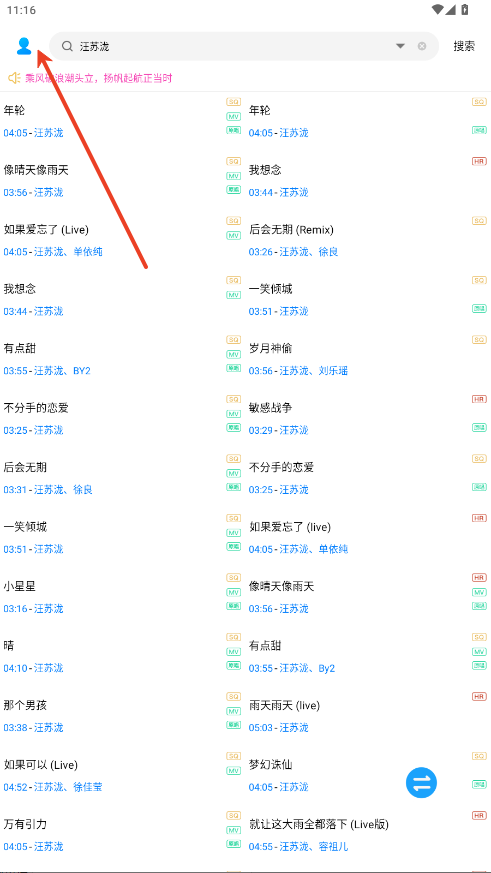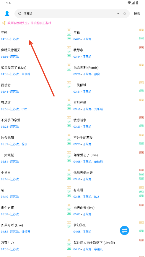 1.进入软件,在上方搜索框内输入自己想听的歌曲点击搜索。
