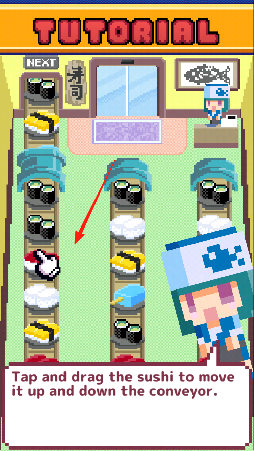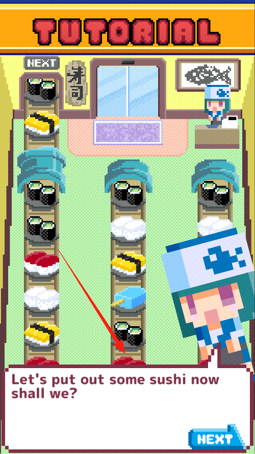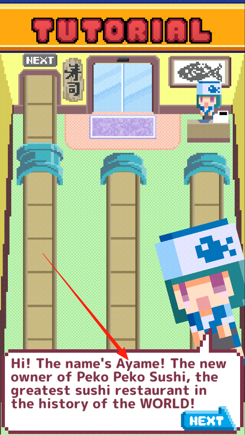 1、点击NEXT推进教程,跟随Ayame的指引,了解寿司店经营背景,开启新手引导流程,熟悉角色设定。