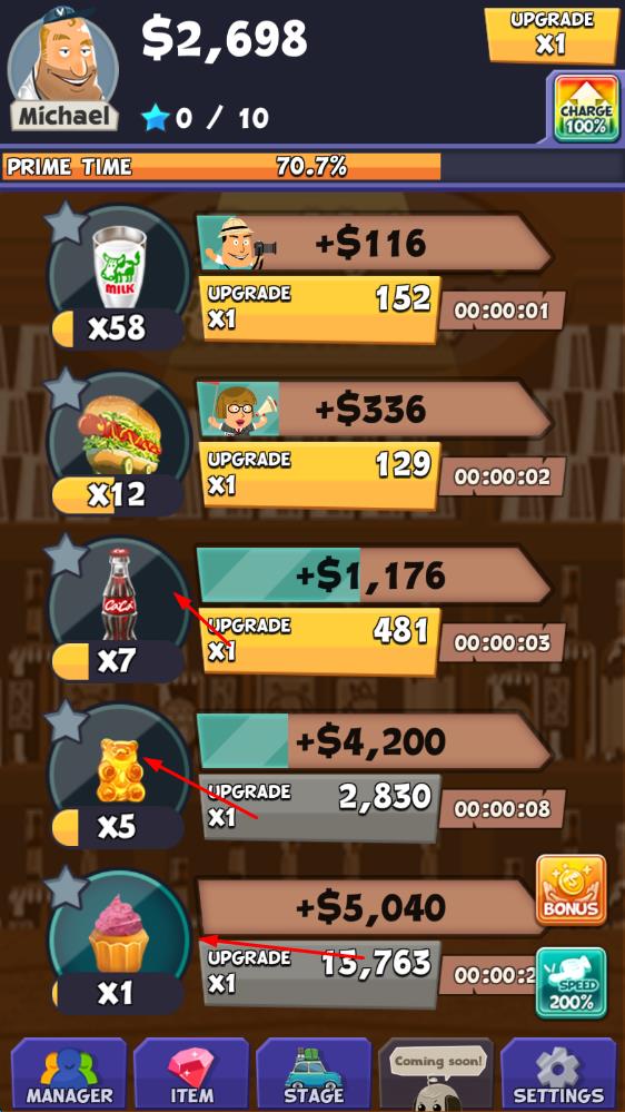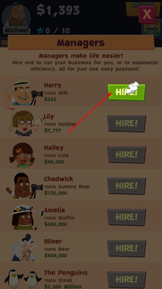 2、经营中途,当生意步入正轨后,可雇佣经理协助管理,减少手动操作,同时参与时间攻击模式,在黄金时间内快速点击屏幕赚大钱,积累更多资本扩大经营。