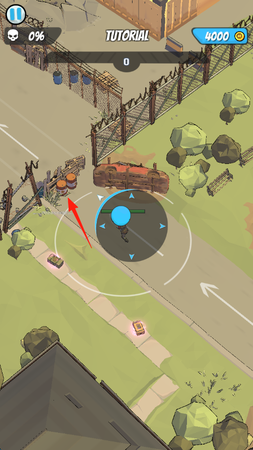 2、按箭头方向,穿过城镇区域汽车、建筑间,留意围栏缺口、道具箱,推进至下一场景,触发敌人出现。