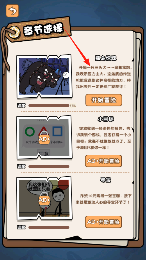 1、进入游戏主界面,找到章节选择板块,点击孤岛惊魂章节卡片,阅读背景介绍,了解冒险起因。