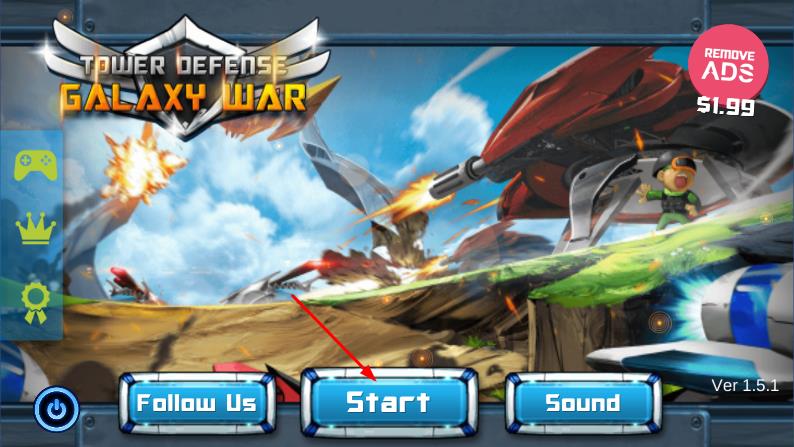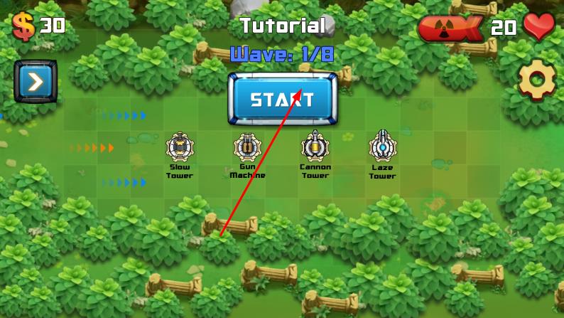 1、进入游戏,在关卡选择界面,选择关卡1,进入场景后,当前是第1波敌人,点击START按钮,开始防御敌人进攻。