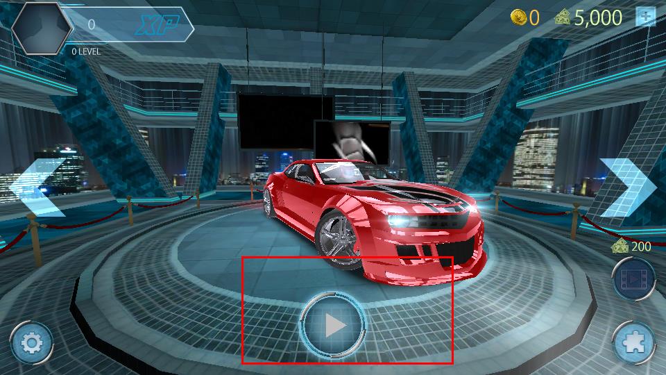 1、进入游戏专属车库场景,画面中央展示定制红色赛车,界面上方清晰呈现XP经验值、金币0、钻石5000等资源信息。