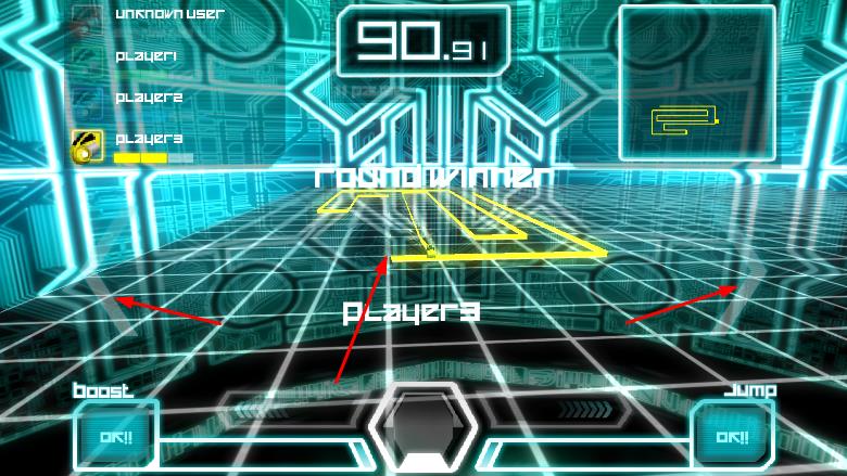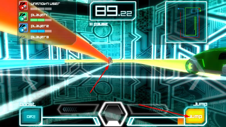 2、右上角显示当前位置地图,通过屏幕下方的boost和Jump按钮,控制光线单车的加速和跳跃。
