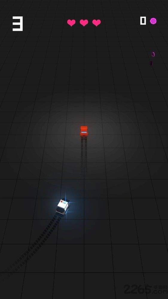 2、在游戏场景,操控红色赛车移动,通过滑动或点击操作,躲避周围其他车辆,收集紫色道具。