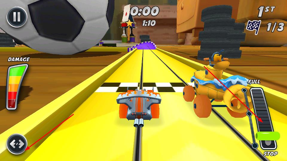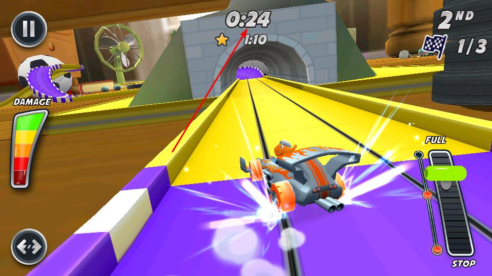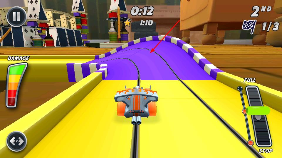 2、在赛道行驶时,沿跑道指引方向前行,跨越紫色坡道等路段,注意避开障碍保持速度。
