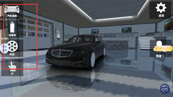 2、在游戏中,左侧的功能按钮可用于进行汽车选择、前往油漆店、车店等操作,合理利用这些功能定制专属赛车。