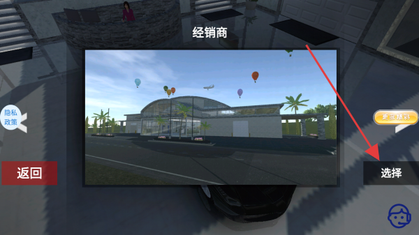 3、在经销商界面,点击选择按钮,可选择不同的经销商场景,继续游戏,体验不同的赛车驾驶环境。