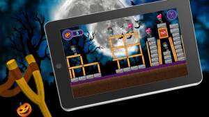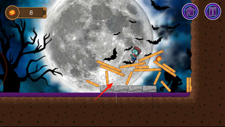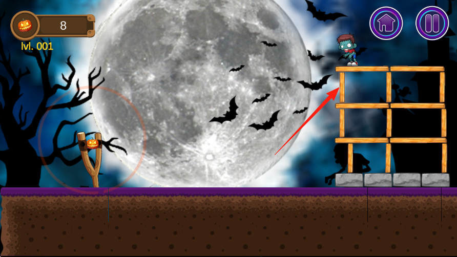 3、木架摧毁后僵尸摔落地面或被建筑碎片砸中,血量归零则通关,积累南瓜数解锁新弹弓、道具。