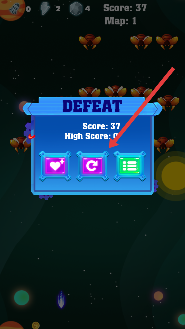 3、游戏关卡中只有一条性命,碰到敌人或者被弹幕集中都会失败,需要点击中间的按钮,重新挑战。