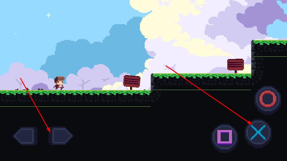 2、引导角色从初始草地场景出发,遇地形落差如草地与石质高地衔接处,点击右侧跳跃键,精准跨越障碍,探索隐藏路径,避开陷阱区域。