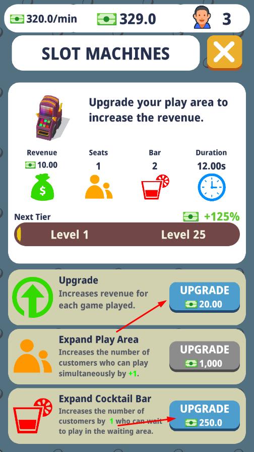 1、设施扩建策略:初期优先升级老虎机提升基础收益,积累一定资金后解锁桌游区吸引稳定客源,根据顾客流量合理规划设施布局。