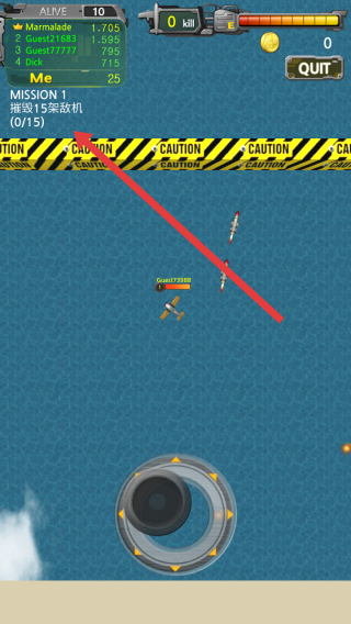 2、进入对战后,左上角显示任务摧毁15架敌机0/15,需要操控战机攻击空中敌机,同时留意上方存活玩家排名。