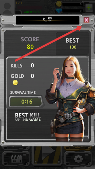 3、对局结束后,在结算界面查看得分、击杀数、生存时间等数据,点击右上角红色关闭按钮,退出结果页面。