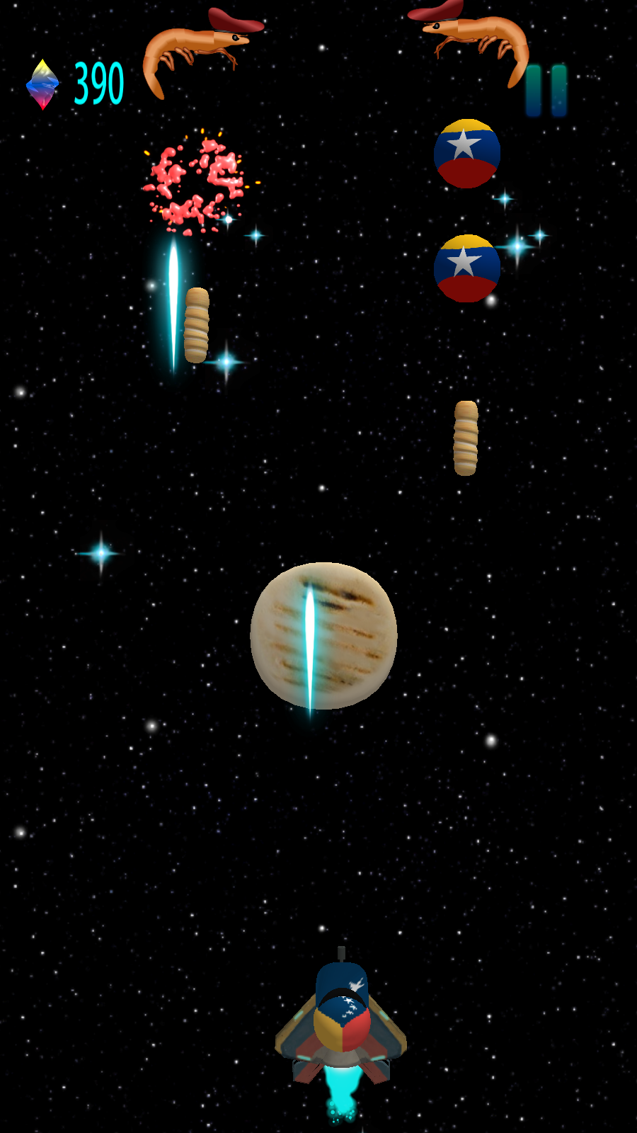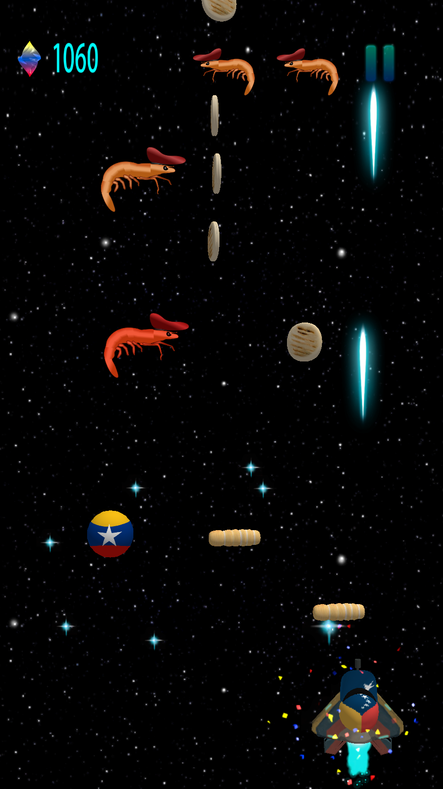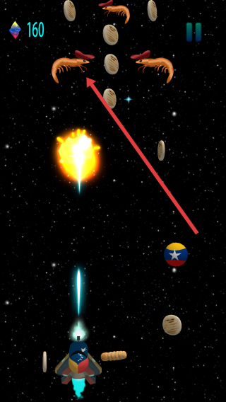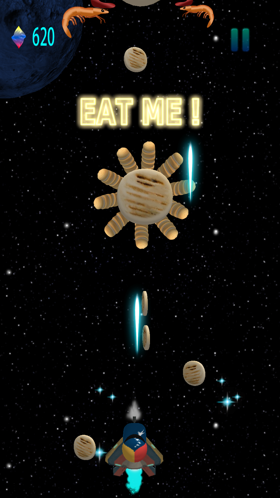 3、在关卡中,滑动屏幕操控飞船可躲避射击空中的虾、陨石等障碍物,收集道具,持续向前飞行。