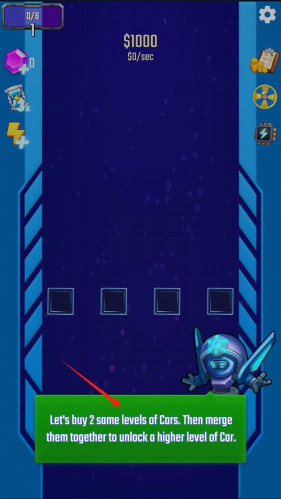 1、在游戏中,按照提示,购买两辆同等级的汽车,进行合并操作,解锁更高级别的汽车,增强自身实力。