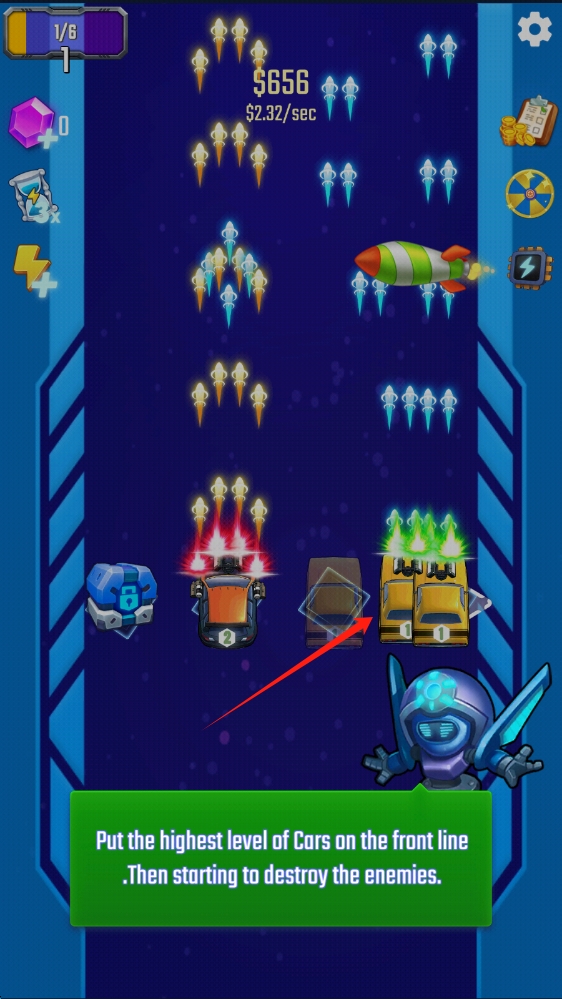 3、根据提示,将最高等级的汽车放置在前线位置,充分发挥其强大战力,有效消灭敌人,推进游戏进程。