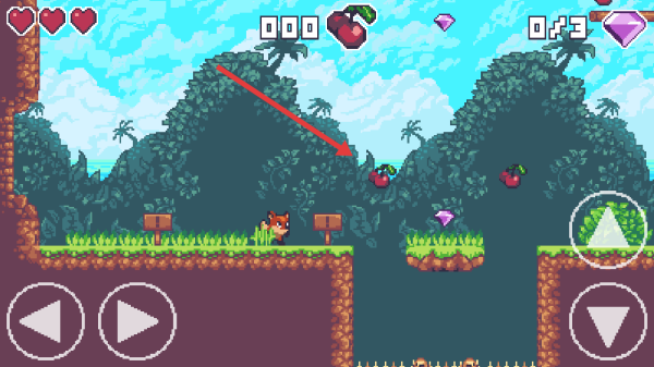 3、操控像素角色在丛林场景移动,跳越沟壑,沿箭头收集樱桃、钻石,达成目标推进关卡进程。