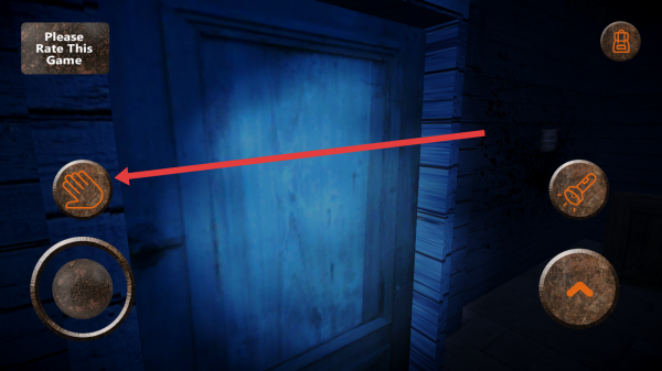 3、来到房门前,通过点击左侧手掌按钮,尝试与门交互,进入房屋内部,推进游戏剧情。
