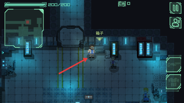 3、操控角色在科幻场景移动,循箭头指引,抵达标箱子处,触发后续互动,推进游戏进程。