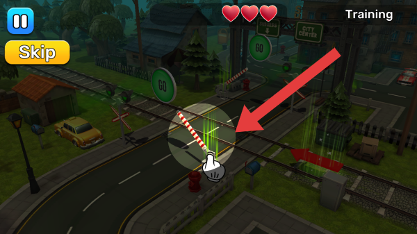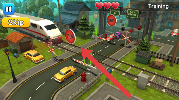 2、处于列车驾驶员培训Training环节,画面中有高速列车、多辆汽车、铁路道口设施,还有STOP标识,可点击Skip的按钮。