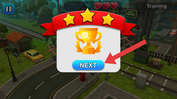 3、完成Training训练环节后的界面,显示获得三星评价,点击NEXT下一步按钮,可点击进入后续内容,背景呈现铁路道口等场景元素。