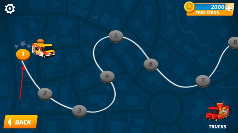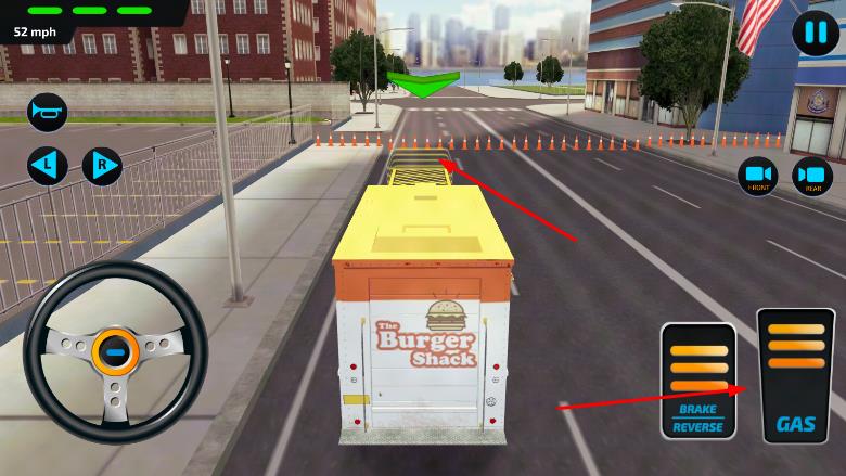 1、进入游戏,在关卡选择界面,选择关卡1,进入驾驶场景后,通过屏幕中的方向盘控制餐车方向,点击GAS按钮加速,BRAKE按钮刹车或倒车。