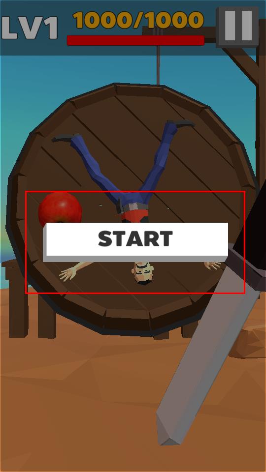 1、进入LV1界面圆盘上角色倒立,点击START按钮,开启游戏,准备投掷飞刀挑战。