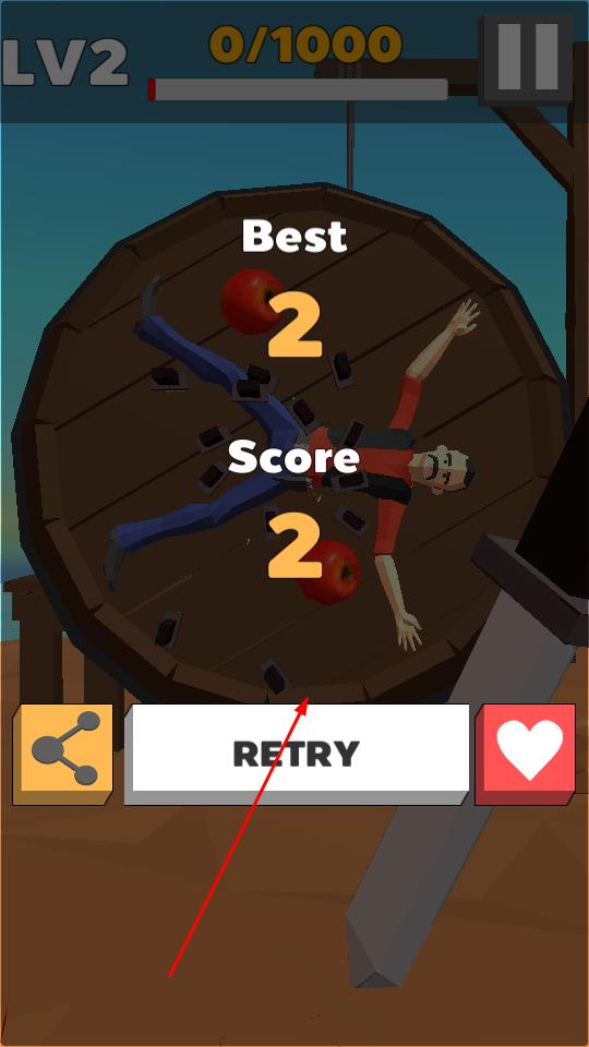 2、在LV2等关卡圆盘旋转,观察角色与苹果位置,看准时机发射飞刀,命中苹果推进进度条,避开角色身体。