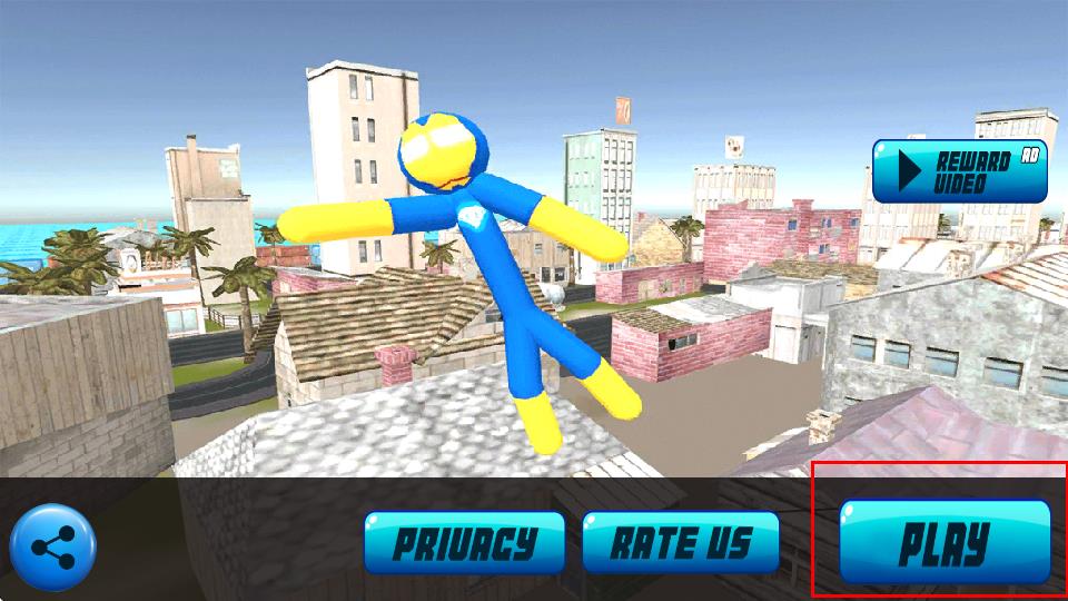 1、进入游戏主界面,点击PLAY按钮,操控蓝黄配色火柴人,开启城市冒险之旅。