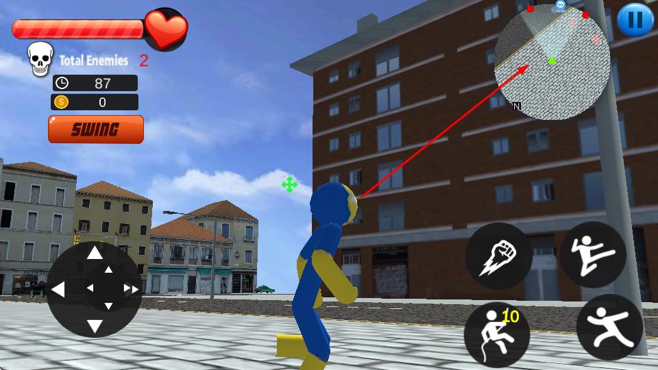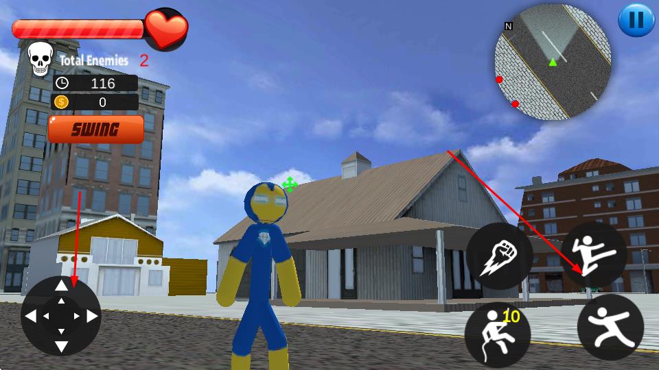 2、在城市场景,通过左侧虚拟摇杆控制移动,右侧技能按键释放攻击、跳跃等动作,追踪消灭敌人。