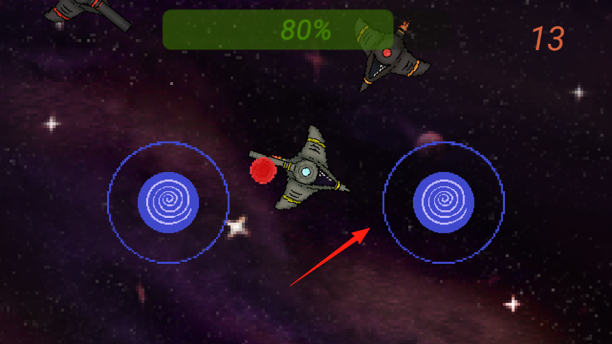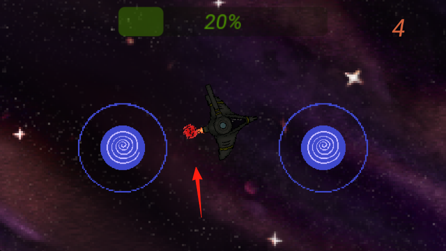 3、每波消灭一定敌人黑色飞船,进度条增长20%→80%,右上角数字提升波次分数。