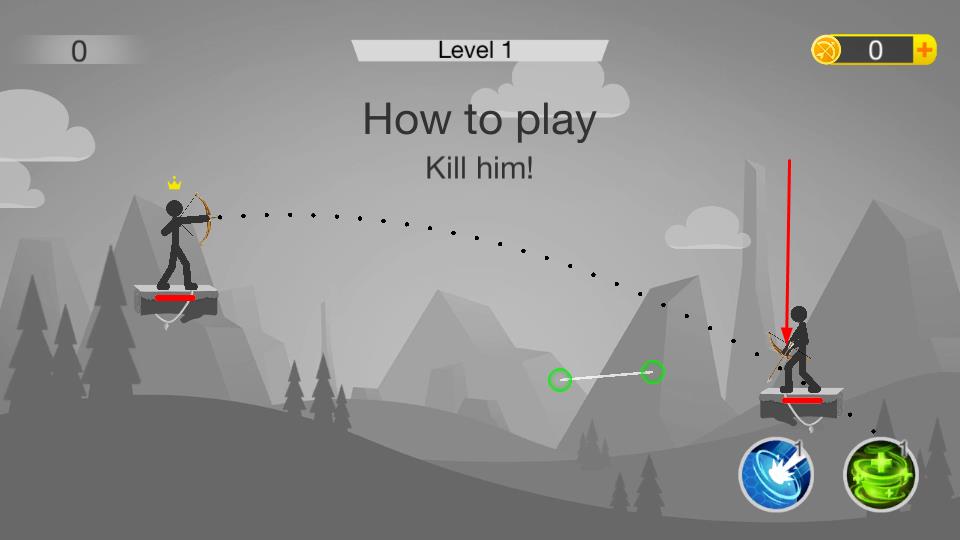 1、进入游戏Level 1界面,明确目标Kill him!,点击屏幕调整射箭角度与力度,射出箭矢攻击敌人。