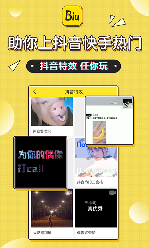 Biu神器一款由广州华多网络科技有限公司精心打造的视频图片制作APP。它堪称多功能手机神器,涵盖表白、恶搞、炫富、p图、斗图等丰富多样的功能。有了它,广大用户朋友能尽情享受更开心的生活娱乐。只需轻轻“Biu”的一下,你就能收获更多赞!下载Biu神器,相当于同时拥有斗图神器、表白神器、恶搞神器和小视频神器。