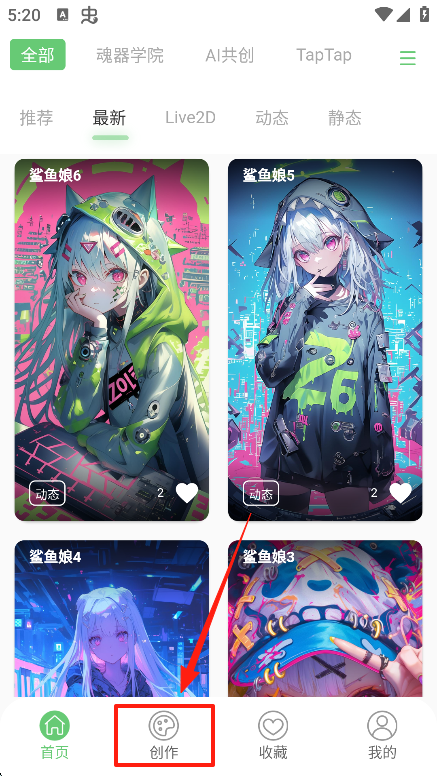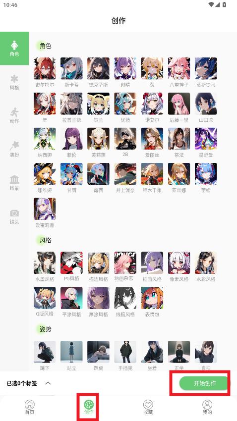 3.创作界面还未定级提供了创作功能,你可以选择角色,风格,姿势,点击开始创作
