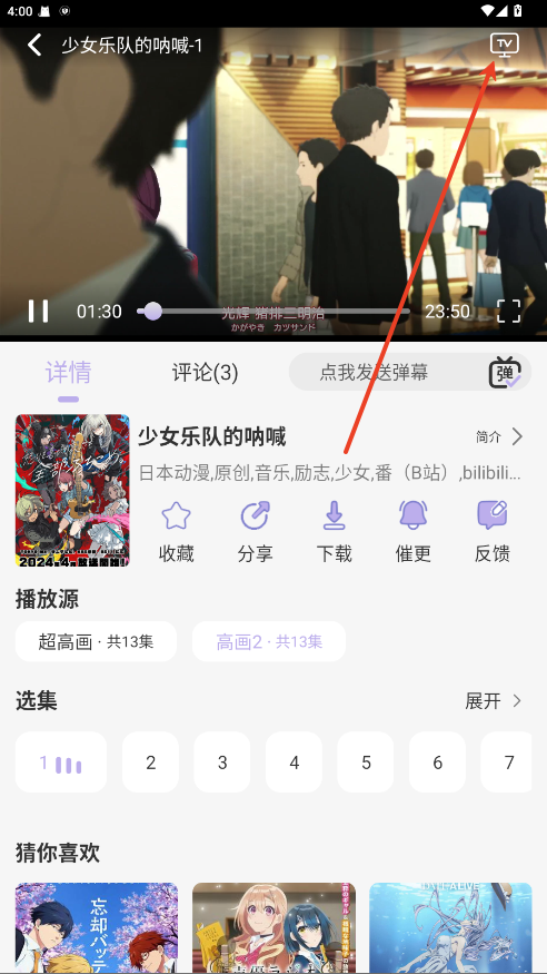 2.点击右上角TV投屏。