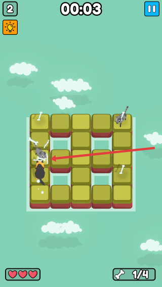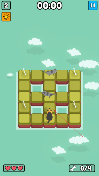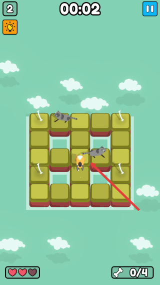 2、注意上方时间的限制,需要规划最短的路径,优先拿角落骨头,避免被猫包围,保持血量爱心。