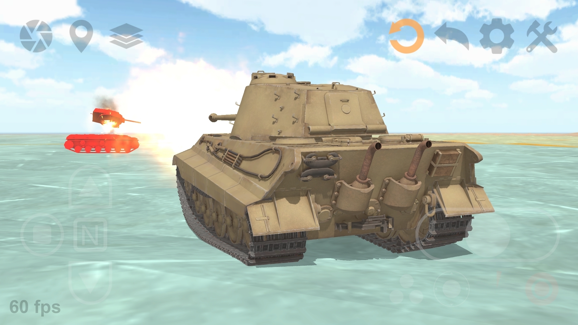 3、游戏内左边按钮控制前进,右边按钮控制左右方向,右下角第一个按钮控制开炮,第二个按钮则让炮塔跟随摄像机旋转。