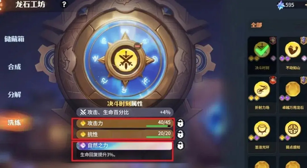 龙石洗练词条,刷新得到金色词条后,战力也会提升不少,激活稀有词条,战力会加得更多。