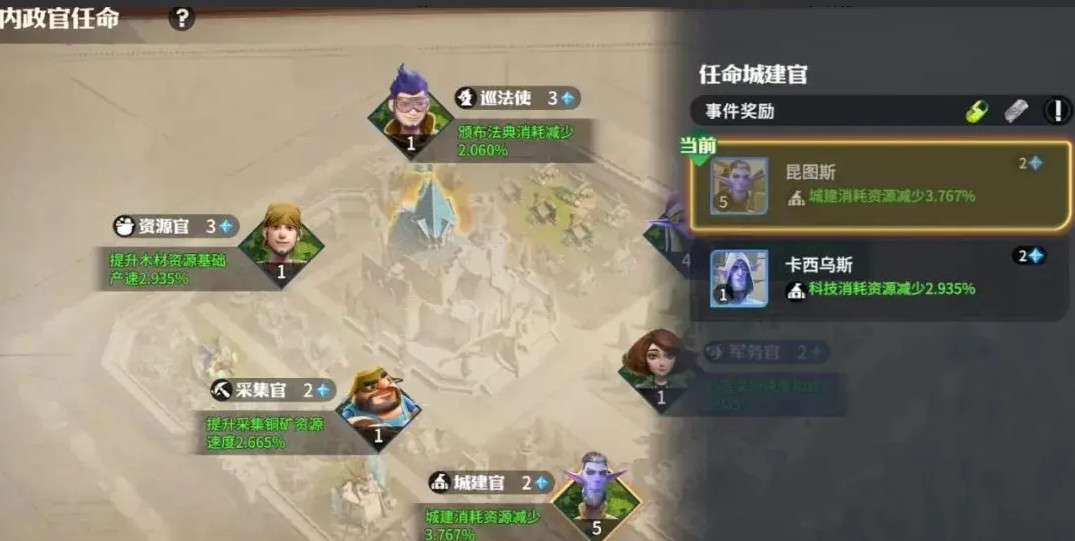 内政官任命后,会在对应的资源采集,资源生产,法典消耗,城建,科技,制造军饷,获得英雄升级材料跟士兵进阶材料获得额外提升效果,也有战力加成。
