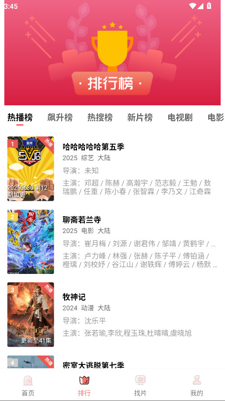 4.点击下方的排行,即可看到最新的热播榜、飙升榜、热搜榜等榜单内容。