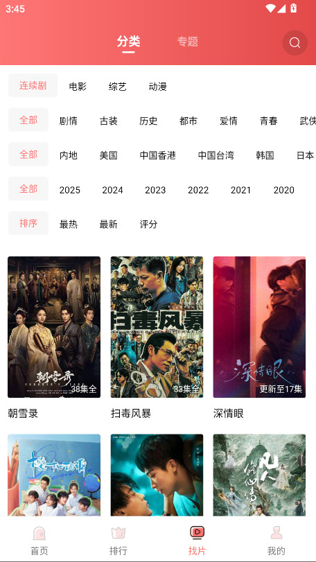 5.点击下方的找片板块,即可看到根据剧情、区域、时间分类的影视剧资源。