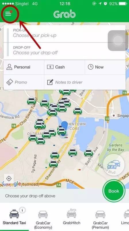 手机下载“Grab Car”,进入后,点击左上角的菜单栏…