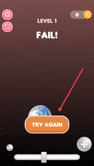 3、若挑战失败界面显示FAIL,点击下方TRY AGAIN按钮重新开始,调整操作确保地球通过轨道。